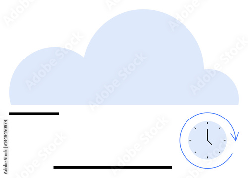 Large cloud shape with a small clock and arrow indicating time tracking. Ideal for data storage, cloud computing, file synchronization, system backup, time efficiency, technology tools, flat simple