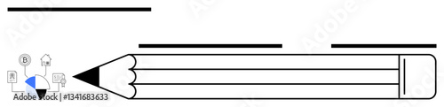 Large pencil extending into icons symbolizing data chart and blockchain network. Ideal for creativity, innovation, design, data analysis, technology, education, blockchain, and communication