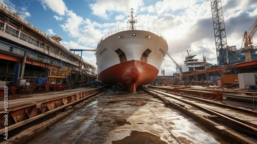 Large ship in a dry dock, surrounded by cranes and industrial facilities.