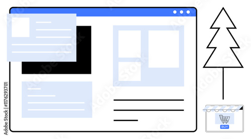 Layout showing information blocks, highlighted shopping cart, and abstract tree. Ideal for web design, e-commerce, user interface concepts, online shopping, information architecture, minimalism in