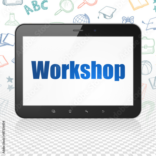 Learning concept: Tablet Computer with blue text Workshop on display, Hand Drawn Education Icons background, 3D rendering