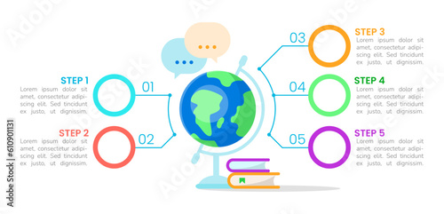 Learning for geography class infographic chart design template. Abstract vector infochart with blank copy spaces. Instructional graphics with 5 step sequence. Visual data presentation