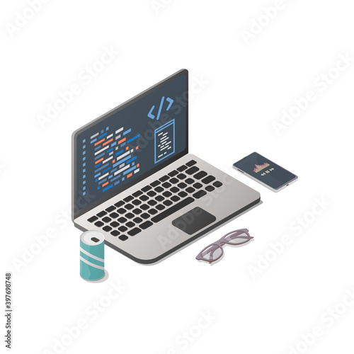 Learning to code. Programing concept. Isometric vector illustration. Isolated on white background.