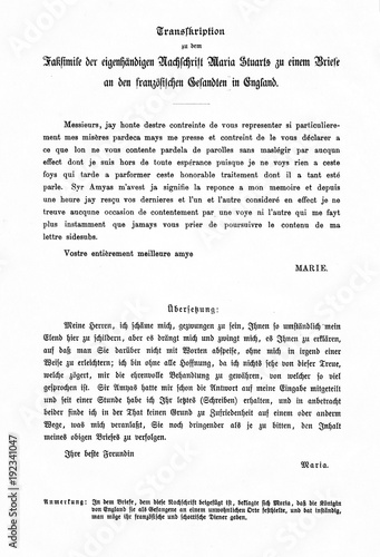 Letter from Mary, Queen of Scots, to the french ambassador in England (from Spamers Illustrierte Weltgeschichte, 1894, 5[1], 642/643)
