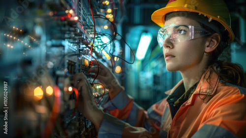 Licensed female electrical engineer checking electrical circuit for high current and voltage,