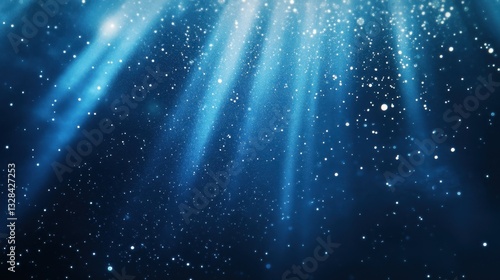 Light beams shining through falling snow particles on blue background