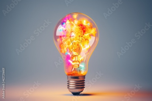 Light bulb with colour explosion on blue background, created using generative ai technology