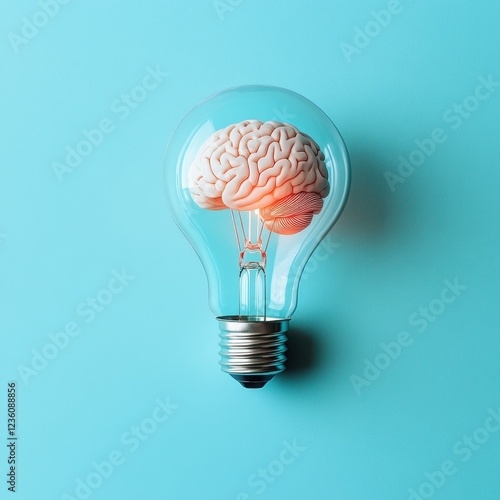 Light Bulb with Glowing Brain Inside, Set Against a Light Blue Background, Symbolizing Creativity and Intelligence