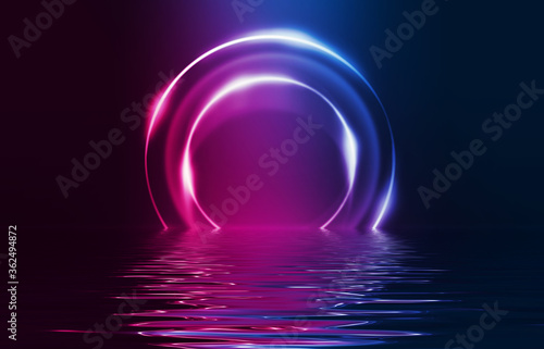 Light neon effect, energy waves on a dark abstract background. Laser colorful neon show. Reflection of light in the water. Smoke, fog. 3d illustration