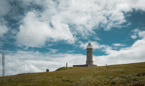 Lighthouse on grassy hill under cloudy sky