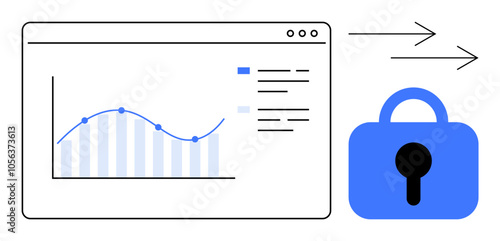 Line graph interface with data points and bars next to a lock symbol and arrows for data flow. Ideal for security data analytics cybersecurity data transmission information technology