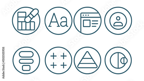 Line style icons of app development: color palette for UI, font pair ring, style guide icon, button shapes badge, UI spacing symbol, visual hierarchy icon, accessibility elements ring, contrast test.