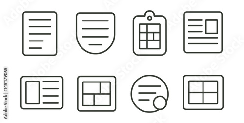 Line style icons of infographics layouts: vertical layout icon, horizontal layout badge, grid-based tag, alignment system file, sectioned infographic board, modular design chart, balanced visual