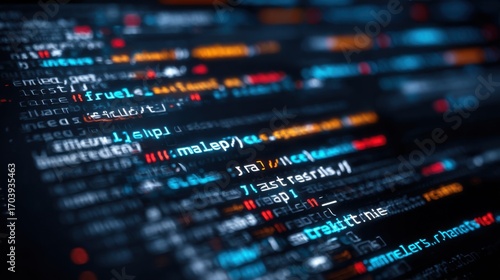 Lines of code display various programming elements and syntax in a dark environment, showcasing the colorful nature of digital development and coding practices at night.