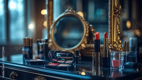 Lipsticks in natural tones displayed on a textured vanity table with a gold-rimmed mirror, surrounded by delicate makeup tools and soft lighting, captured with realism through a camera.