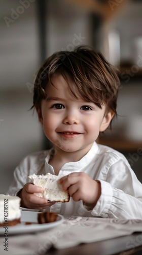 Little boy eating cake.