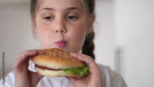 little girl eating a hamburger. lifestyle unhealthy fast food proper nutrition concept. child greedily with pleasure bites a big burger in the kitchen at home. kid eats fast food close-up
