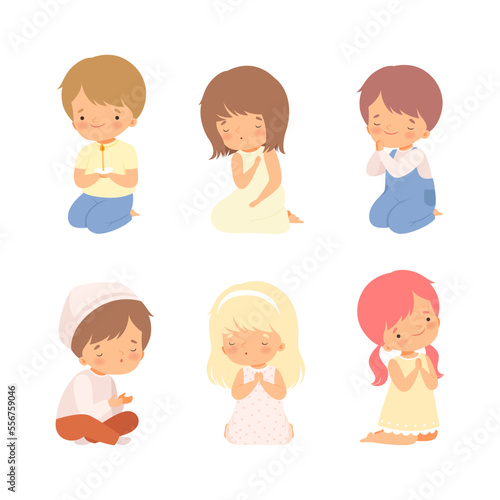 Little Kid Kneeling and Praying with Folded Hands Vector Set