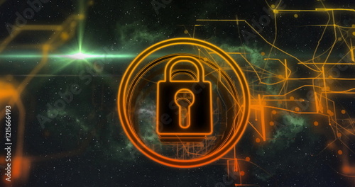 Lock and key symbol with digital security image over space background