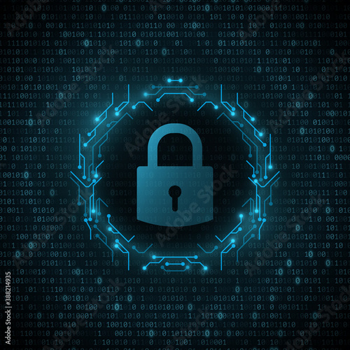 Lock icon in frame of circuit computer board with glowing binary code background. System security and protection from hackers. Programming design. Futuristic banner. Vector illustration