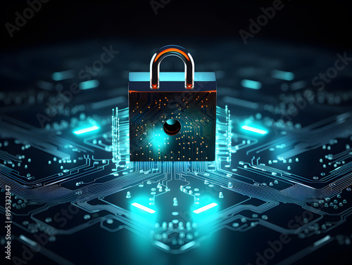 Lock with circuit pattern. Concept of data security, cybersecurity, cyber defense. AI generative