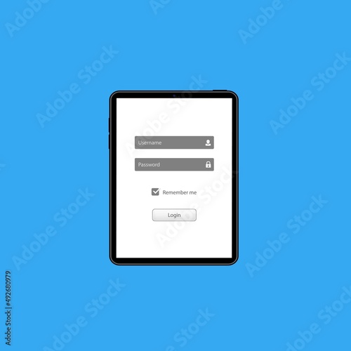 Log in screen on tablet. Mobile application interface, registration form with login and password fields. Website UI with buttons and network account.