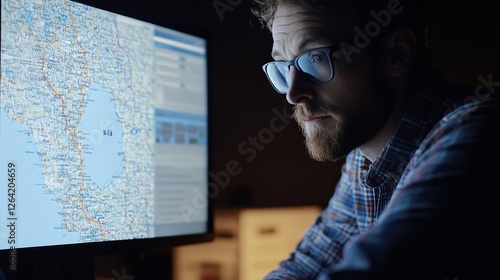 Logistics manager analyzing digital map with live shipment tracking.