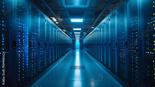 Long corridor in a modern data center with rows of server racks