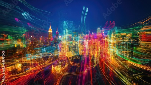 Long exposure of city lights with colorful motion trails, creating an abstract and vibrant representation of modern urban life.