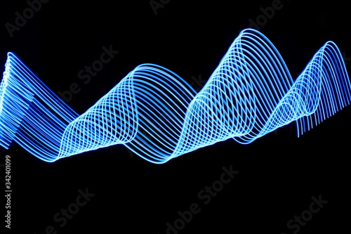 Long exposure photograph of blue neon colour in an abstract swirl, parallel lines pattern against a black background. Light painting photography.