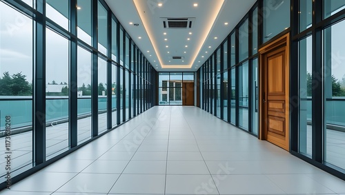 Long hallway featuring transparent glass walls and doors