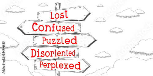 Lost, confused, puzzled, disoriented, perplexed - outline signpost with five arrows