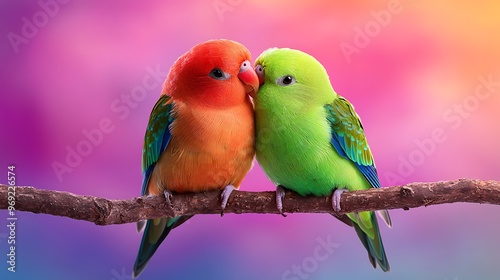 Lovebirds sit side by side on a branch, framed by a backdrop of vibrant colors.