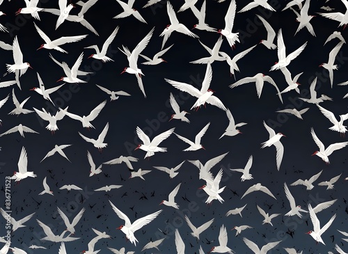 Low flying arctic tern bird swarm silhouette repeating pattern abstract