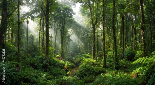 Lush forest interior with sunlight streaming through trees