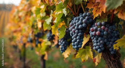 Lush grape clusters framed by warm fall foliage hues in vineyard