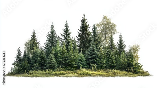 Lush green coniferous forest with dense trees in natural setting isolated on transparent background