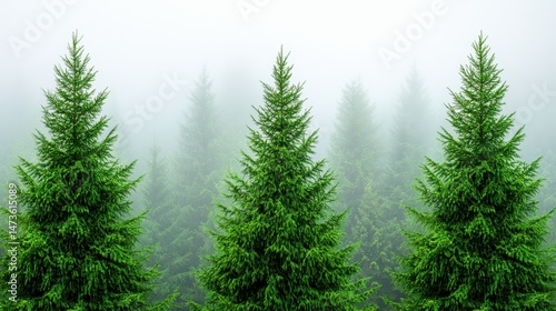 Lush Green Pine Trees in a Dense Misty Forest Landscape Scene