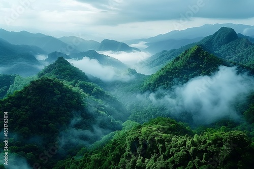 Lush Misty Forest Peaks Stretching Across Serene Mountain Range at Dawn