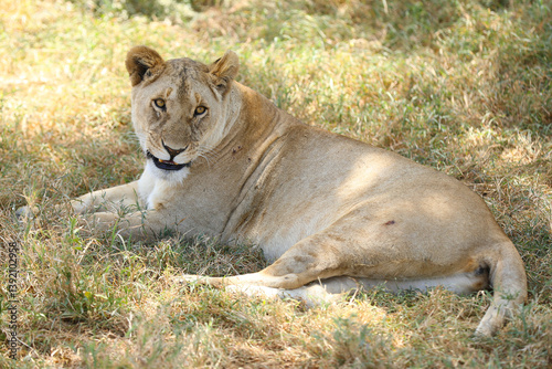 Löwin grinsend im Schatten