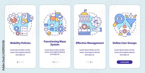 MaaS introduction components onboarding mobile app screen. Data walkthrough 4 steps editable graphic instructions with linear concepts. UI, UX, GUI template. Myriad Pro-Bold, Regular fonts used