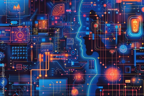 Machine learning algorithms that are actively processing large amounts of data. The central part of the image contains a machine learning model.
