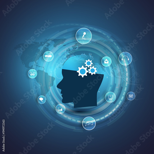 Machine Learning, Artificial Intelligence, Cloud Computing and Networks Design Concept with Icons Representing Various Information Medium and Services - Big Data,Information Processing,Global Control