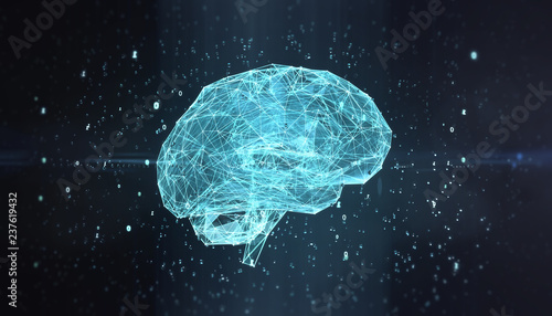 Machine learning,Fog calculations, artificial intelligence, ai, deep learning blockchain neural network concept. Brain made with shining wireframe net graphic abstract background 3d render.