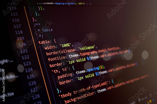 Macro shot of CSS-in-JS code with highlighted syntax on a dark screen, showing modern frontend styling, responsive layout, and web UI component design for digital applications.