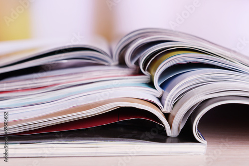 Magazines on wooden table on bright background