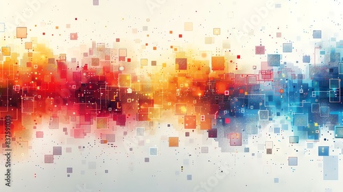 Magazine-style vector illustration of an abstract background with colorful pixel blocks, forming a digital grid pattern with rainbow color squares, ideal for web, print, and social