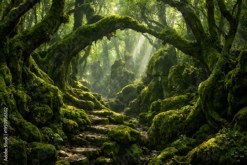 Magical mossy forest with ancient trees and sunlit path