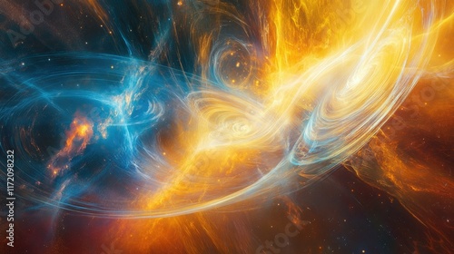Magnetic fields and gravity waves interacting, visualized with electric blue and fiery orange tones, creating a surreal scientific backdrop.