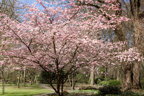 Magnolia tree in the garden near the house. Flowering Magnolia tree